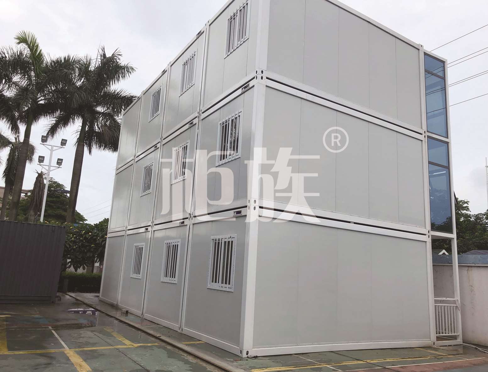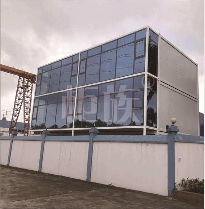 該打包箱辦公室上下三層,在設計上注重功能的實用性和選材用材的環保性。總體約可容納50人的辦公和會議需求。
